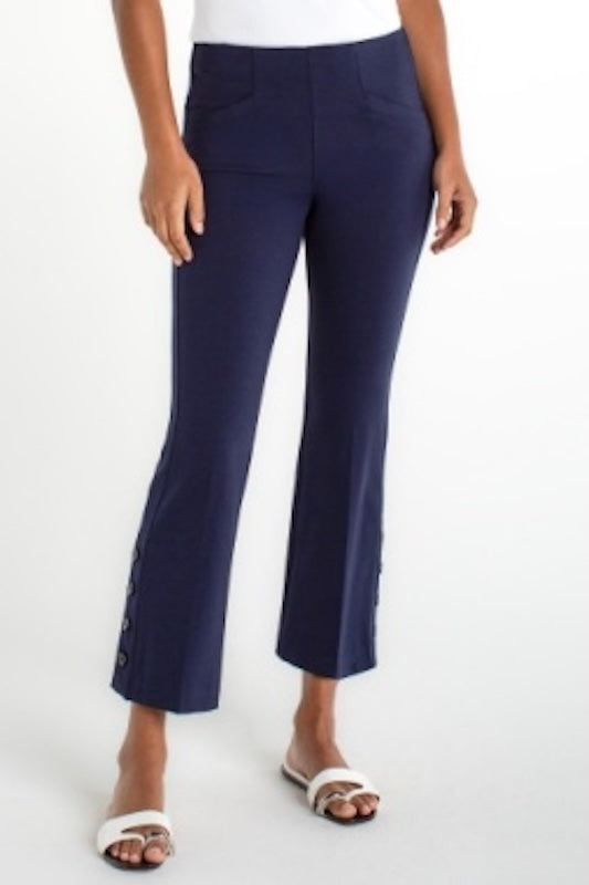 Elevate your everyday style with these polished cropped-flare pants, designed to move with you from workday chic to weekend casual. Crafted from a soft, stretchy blend, these pants feature an inner shaping panel that smooths and flatters for a sleek, confident silhouette. The button-detailed hems add a charming, modern touch, while the pull-on waistband keeps things effortlessly comfortable.