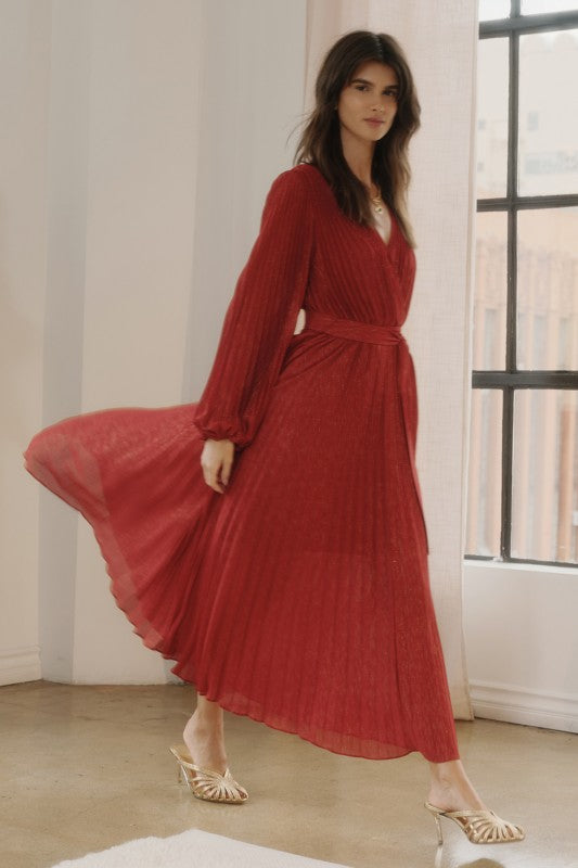Turn heads this holiday season in our Metallic Pleated Wrap Midi Dress — a true show-stopper designed for festive elegance. Crafted from flowy chiffon with a subtle metallic sheen, this dress features a surplice wrap front that flatters every silhouette. The elasticized waist with a self-tie belt defines your shape, while long billowy sleeves add a touch of romantic movement.