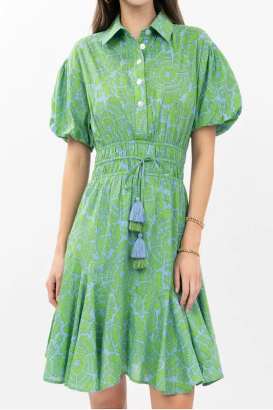 Meet your new go-to dress! This dress in vibrant green combines vintage-inspired details with modern comfort. The button-up placket and classic collar bring timeless sophistication, while short puffed sleeves add a playful touch. Adjust the drawstring on the gathered waist with its charming tassel accent for a customized fit, and let the flounced hem create beautiful movement with every step.