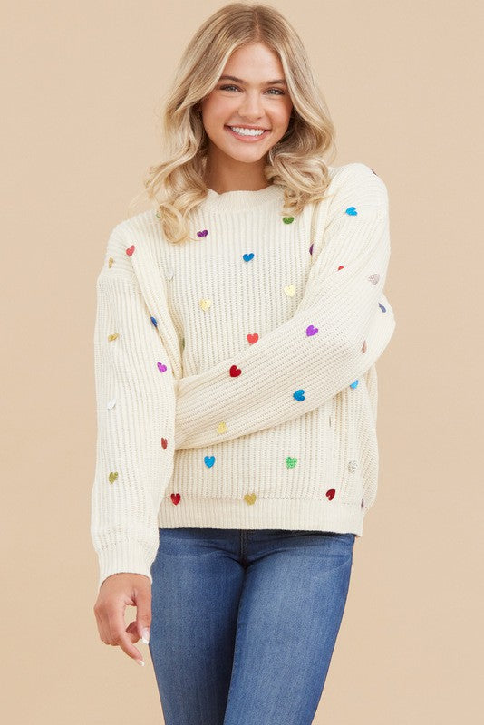 MULTICOLOR ALL OVER MINI HEART CHUNKY KNIT SWEATER