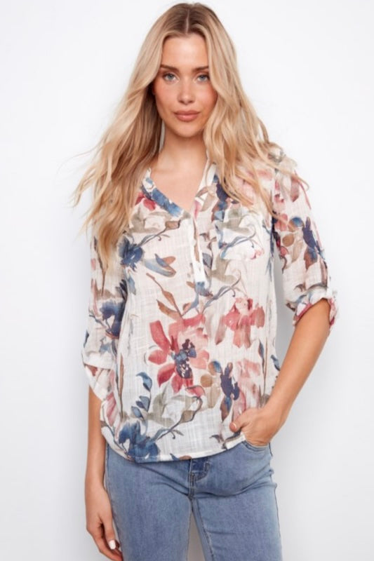 Embrace effortless elegance with this printed cotton gauze blouse featuring a soft watercolor floral pattern. The lightweight cotton-modal blend offers airy, breathable comfort, while the relaxed silhouette and roll-up sleeves create versatile styling options. A henley neckline with button detail and functional chest patch pocket add casual refinement to this breezy essential.