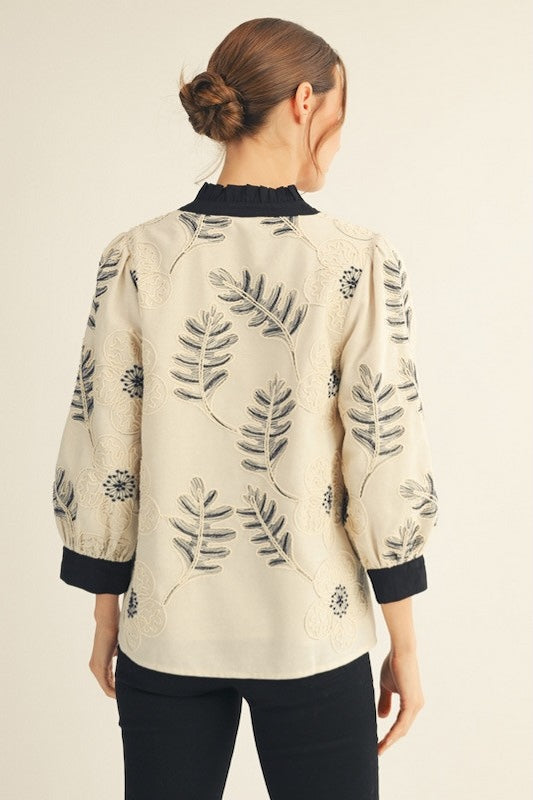 Bring a touch of charm and artistry to your wardrobe with this beautifully crafted embroidered 3/4 sleeve top. Designed with a striking solid contrast neckline and cuffs, this blouse blends polished sophistication with soft, boho-inspired texture. The ruffled split neckline adds the perfect hint of femininity, while the detailed embroidery creates a standout look that feels both stylish and effortless.