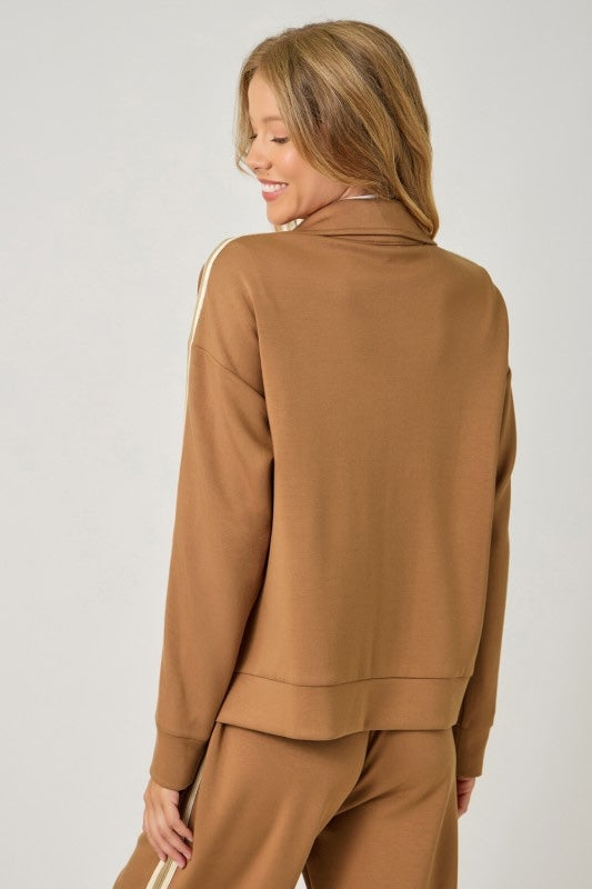 Step into modern athleisure with this tracksuit jacket featuring  stripes along the sleeves. Crafted from a smooth stretch blend of 50% rayon, 45% polyester, and 5% spandex, it delivers both comfort and a sleek silhouette.