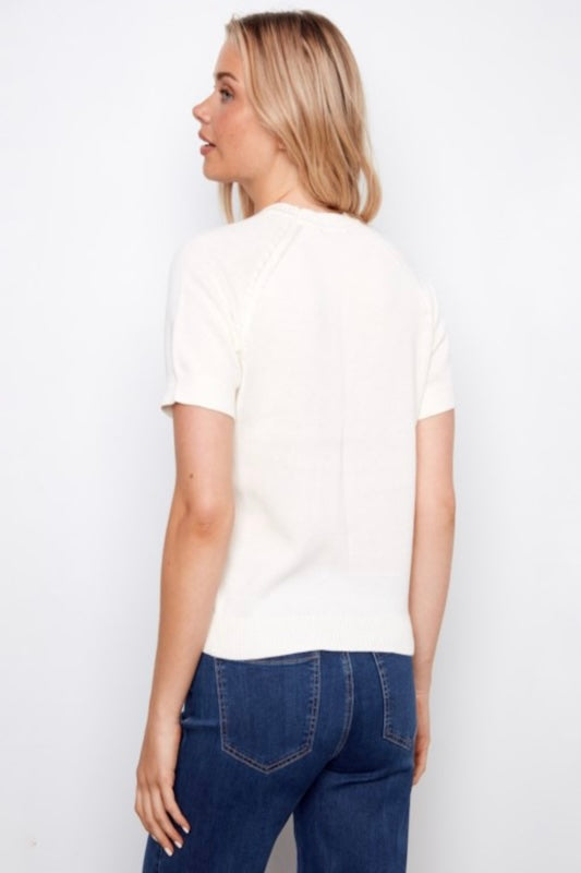 WHIMSICAL RAGLAN SHORT SLEEVE CREW NECK SWEATER WITH PLACED JACQUARD
